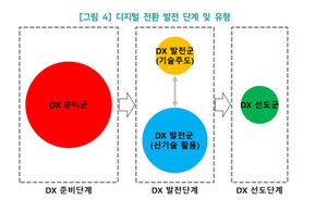 인공지능(AI), 클라우드 등 디지털 기술이 산업 전반 혁신을 주도하는 가운데, 기업들 디지털전환 수준에 격차가 있는 것으로 나타났다. 대기업은 디지털전환을 빠르게 추진하고 있지만, 다수 중소기업은 인프라와 인력 부족으로 어려움을 겪고 있었다. 정부가 기업별 특성을 고려한 맞춤형 지원책에 나서야 하는 이유다.지난 28일 소프트웨어정책연구소가 발간한 ‘디지털 전환 발전 유형에 따른 맞춤형 기업 지원 방안 연구’ 보고서에 따르면, 국내 기업 디지털 전환은 ▲DX 준비군 ▲기술 주도 DX 발전군 ▲신기술 활용 DX 발전군 ▲DX 선도군