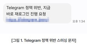 "텔레그램 정책 위반, 지금 바로 재로그인 진행 요청."텔레그램 사용자 중 이같은 문자메시지를 받았다면, 인터넷주소(URL)를 클릭하기 전 스미싱을 가장 먼저 의심해야 한다. 안랩 시큐리티 인텔리전스 센터(ASEC)에 따르면 8월 현재 실제 사이버공격자들은 이같은 문자를 전송해, 실제 텔레그램과 유사한 사이트 접속을 유도하고 있다. 접속된 피싱사이트는 공색 텔레그램과 똑같아 보이지만, 도메인 주소를 살펴보면 'telegram'이 아닌 'taiegram'으로 기재돼 있다. 피싱사이트에서는 사용자 국가와 휴대폰 번호를 요구하고, 이를