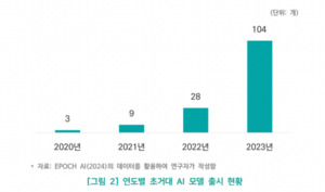 [딜라이트닷넷=권하영 기자] 인공지능(AI) 기술 발전이 본격화된 지난 2020~2023년간 한국은 전세계에서 미국과 중국 다음으로 많은 수의 초거대AI를 출시한 것으로 나타났다.20일 소프트웨어정책연구소가 최근 발간한 ‘글로벌 초거대AI 모델 현황 분석’ 보고서에 따르면, 2020~2023년 기간에 전세계 초거대AI 모델 출시 건수는 누적 144개에 이른다. 2020년 3개, 2021년 9개, 2022년 28개, 2023년 104개 등 해가 갈수록 기하급수적으로 늘고 있는 추세다. 연평균성장률(CAGR)은 226.1%에 달한다.국가별
