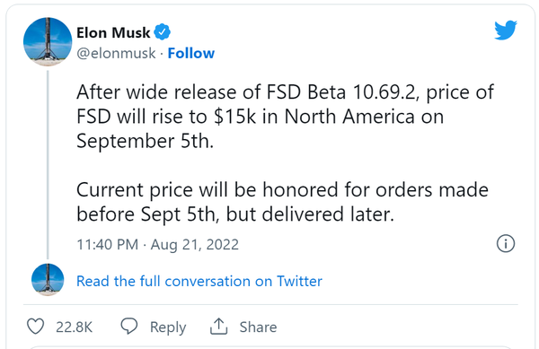 머스크는 "FSD 베타 10.69.2가 대폭 출시된 이후 FSD의 가격은 9월 5일부터 북미에서 1만5000달러(약 2000만원)로 오른다"며 "현재 가격은 인도 시기에 관계없이 9월 5일 이전 주문분에 대해서만 적용된다"고 덧붙였다.