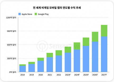 전 세계 비게임 모바일 앱 수익은 올해에도 상승세를 유지하며 550억달러(한화 약 71조6700억원)를 넘기고, 2027년에는 1000억달러(한화 약 130조3000억원)를 돌파할 것으로 예상했습니다.