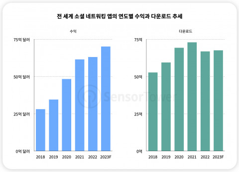 지난해 전 세계 소셜 네트워킹 앱 수익 증가세는 둔화됐지만, 여전히 소폭 상승해 63억달러(한화 약 8조2000억원)를 기록했습니다. 센서타워는 올해 소셜 네트워킹 앱 수익이 70억달러(한화 약 9조1200억원)를 돌파할 것으로 예상했습니다.