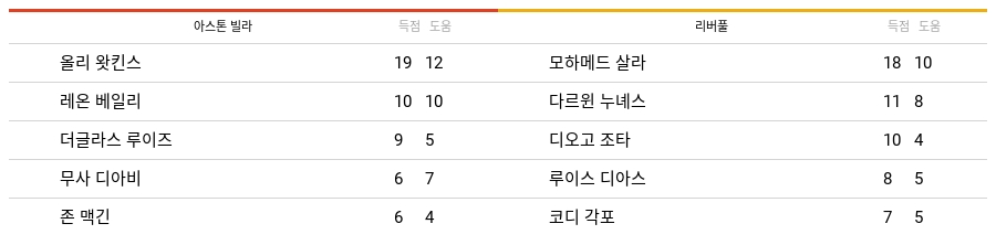 2023-24시즌 아스톤 빌라와 리버풀 사이에서 공격 포인트로 주목받은 선수들의 기록을 아래 표에서 확인할 수 있다.